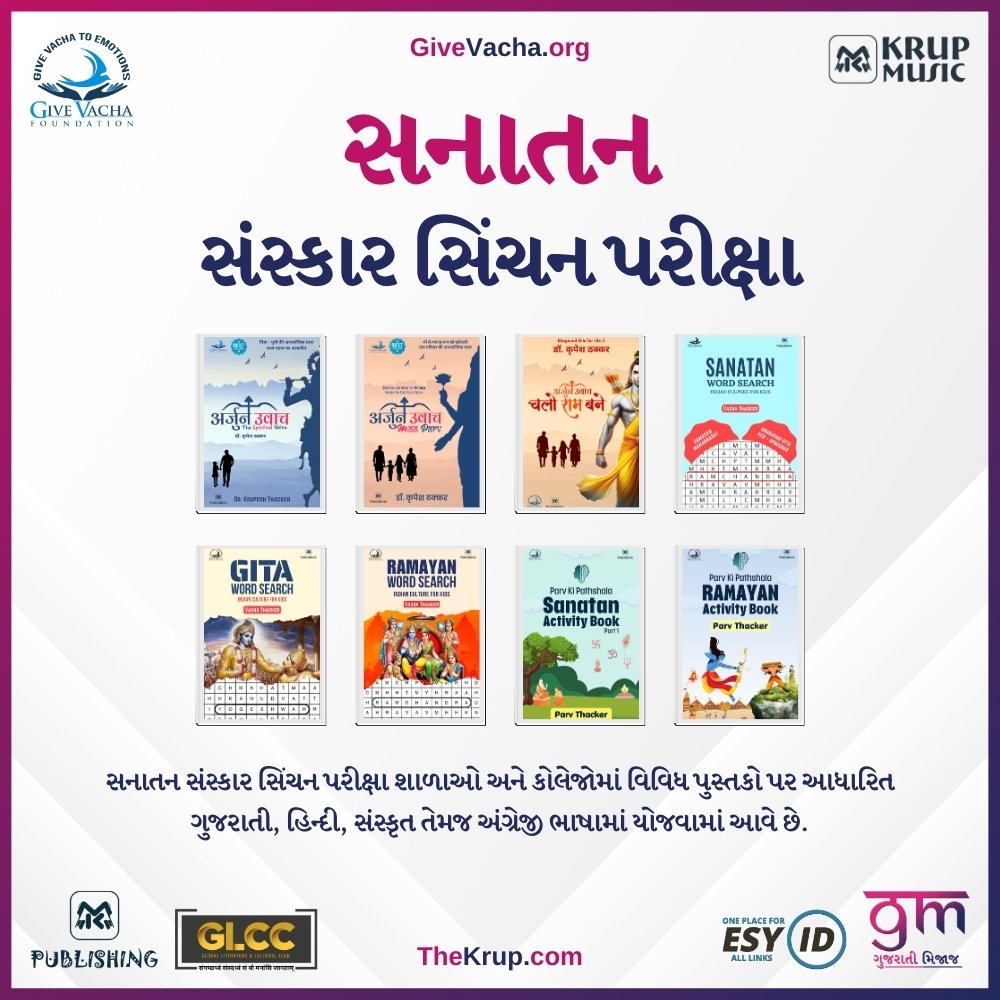 The “Sanatan Sanskar Sinchan Pariksha” is an educational initiative organized by Give Vacha Foundation and Krup Music in collaboration with Gujarati Mijaaj, Krup Publishing, and the Global Literature & Cultural Club (GLCC). This project is an examination focused on Sanatan Dharma and Indian culture, drawing from various books such as the “Sanatan Dharma for Children” series authored by child prodigy Vacha Thacker, the best-selling “Bhagavad Gita for Life” series by Dr. Krupesh Thacker and the “Parv Ki Pathshala” series by child author Parv Thacker.